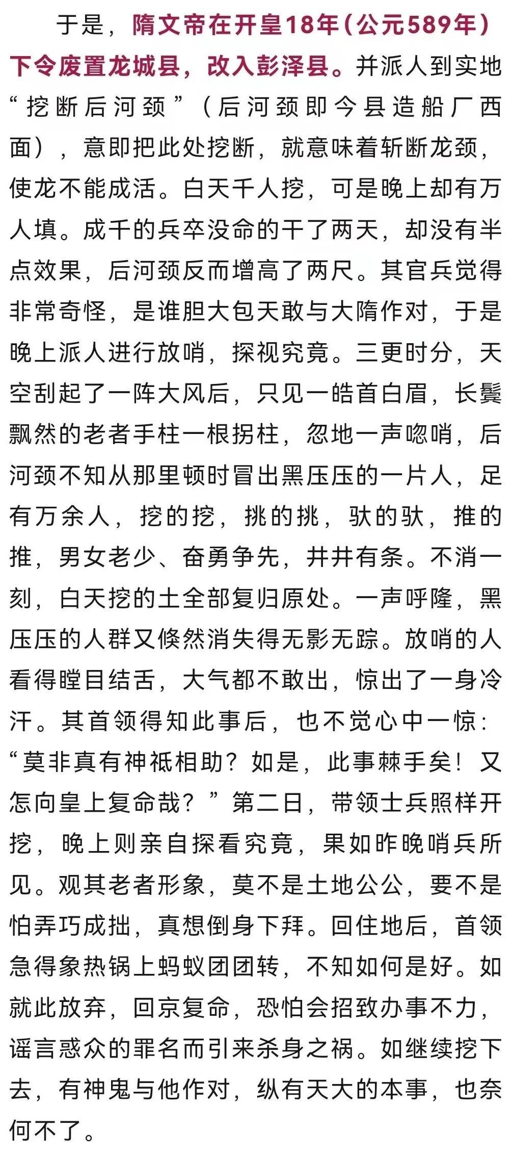 自此以后,一种龙城即将诞生“真龙天子”、并将建都、永无昌盛之说不胫而走。这事传到了隋文帝耳里,他觉得非常害怕,自己辛辛苦苦打下的江山,恐人夺去。于是,即派朝中亲信大臣到龙城核查此事是否属实。