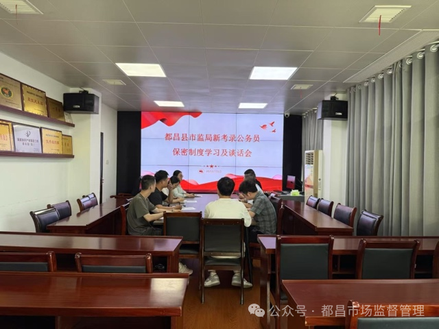 为进一步增强新录用公务员保密意识,筑牢安全防线,7月1日,都昌县市场监管局组织2025年新招录的6名公务员开展保密管理制度专题学习暨集体谈话会,并举行保密承诺书签订仪式,扣好年轻干部廉洁履职的“第一粒扣子”。