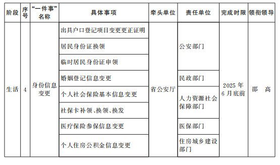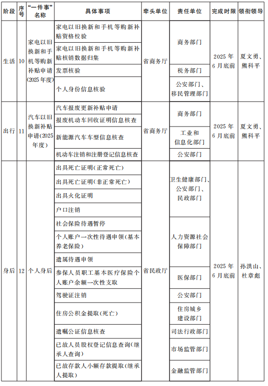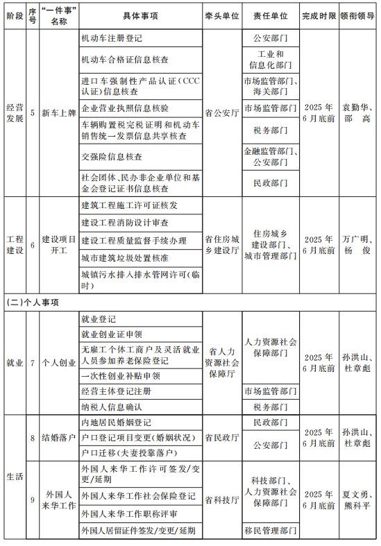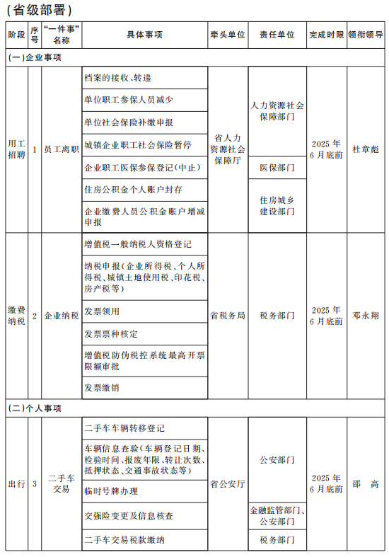 《“高效办成一件事”2025年度第一批重点事项清单》已经省政府同意,现印发给你们,请结合实际认真组织实施。各地各部门要认真贯彻党中央、国务院和省委、省政府关于优化政务服务、推动“高效办成一件事”的决策部署,按照《国务院办公厅关于印发〈“高效办成一件事”2025年度第一批重点事项清单〉的通知》(国办函〔2025〕3号)有关要求,在不断优化2024年度两批重点事项服务的基础上,统筹加快推进我省2025年度第一批重点事项清单实施工作。要注重改革引领和数字赋能,推动流程优化和模式创新,强化组织协调,建立健全跨部门联动机制,推进业务系统互联互通和数据共享,确保重点事项落地见效。要强化政策宣传解读,加强行业指导和经验总结,及时推广重点事项推进中的好经验、好做法。省政府办公厅(省政务服务办)将加强统筹调度,适时督促提醒,确保各项改革任务按期完成。各牵头部门要加快制定实施方案,于2025年3月31日前报省政务服务办,并同步在江西政务服务网发布。2025年3月5日