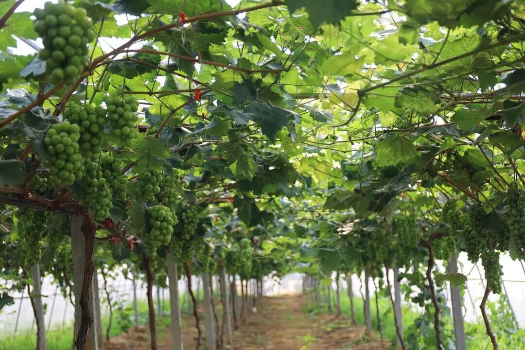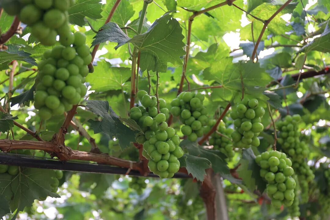 葡萄园内,“夏黑”“巨玫瑰”“阳光玫瑰”“浪漫红颜”等多个品种的葡萄挂满枝头,宛如一颗颗藏在叶片背后的绿珍珠。果农们穿梭在葡萄架间,仔细查看葡萄的生长情况,为每一串葡萄的茁壮成长倾注心血。新光明农业葡萄园负责人沈图珍说:“这片葡萄园基地大概80亩左右,目前有夏黑、巨玫瑰、阳光玫瑰、浪漫红颜等四个品种,亩产量大约3000斤,今年预计产果6万斤。”