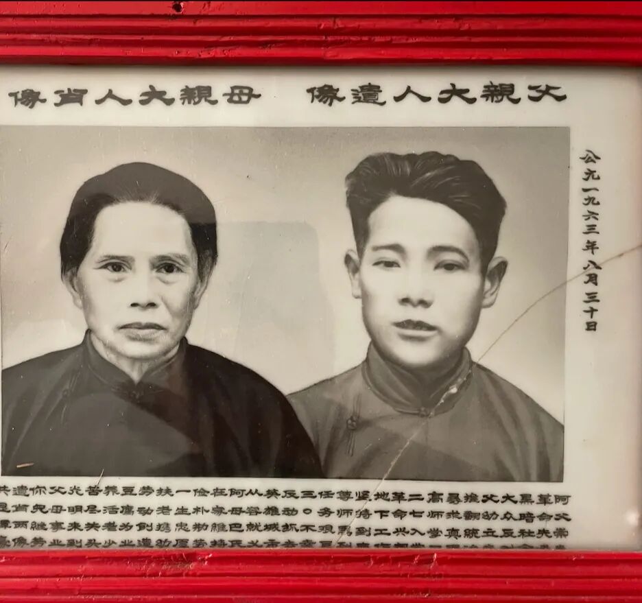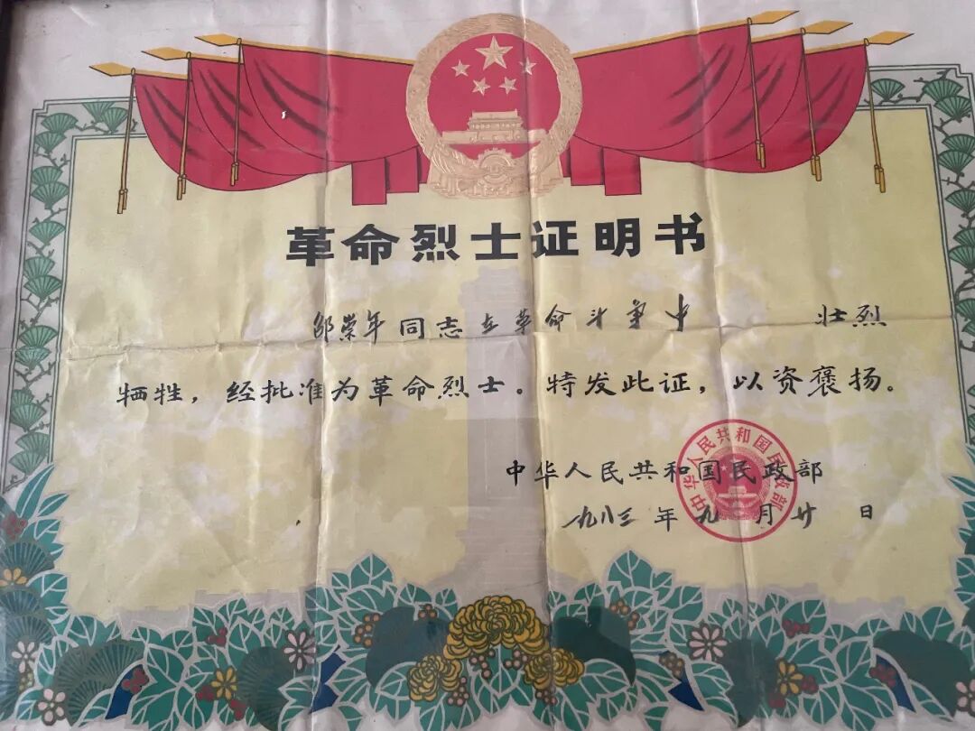 邵建华先生取出家中保存的一幅绘于1963年8月的爷爷邵崇炎与奶奶巴桂香的瓷画像。巴桂香在丈夫牺牲时年仅19岁,后来再婚,生子邵伦福、邵伦和及一女。这位勤劳的光荣之家的母亲,靠做豆腐为生,养育年幼的儿女们,年逾八旬谢世。邵建华讲述,奶奶巴桂香与爷爷邵崇炎俩人的瓷版像是拼合在一起的,夫妻俩在那个年代并未留下合影,但邵崇炎烈士的画像的确是