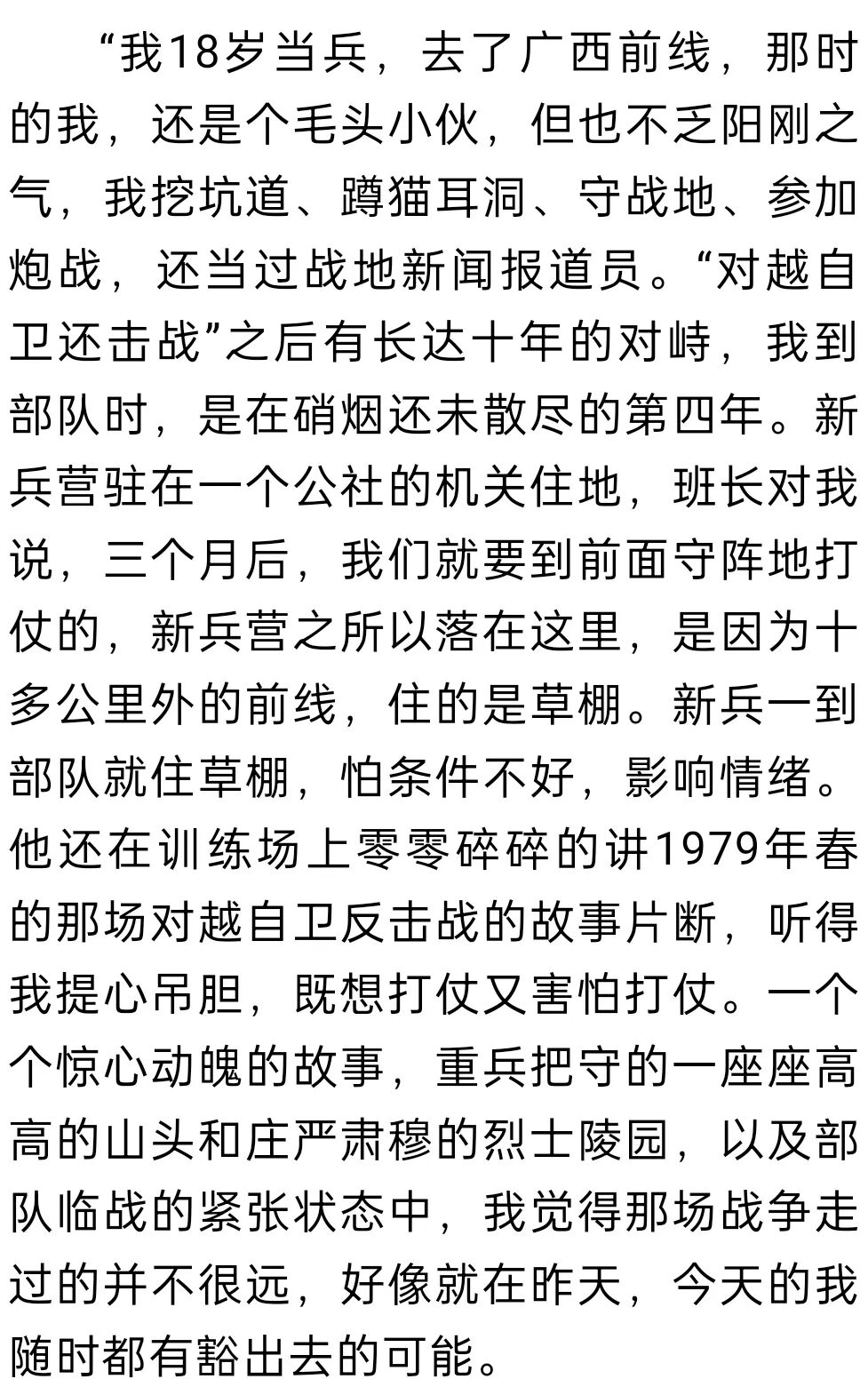 四年转眼即逝,我的名字被写进退伍老兵的行列,我至今还记得在界碑前和战友一一话别,互敬军礼,又最后一次深情的抚摸界碑。回眸间,边界的深处,有几位军人走来,那是我死而复生的战友……”