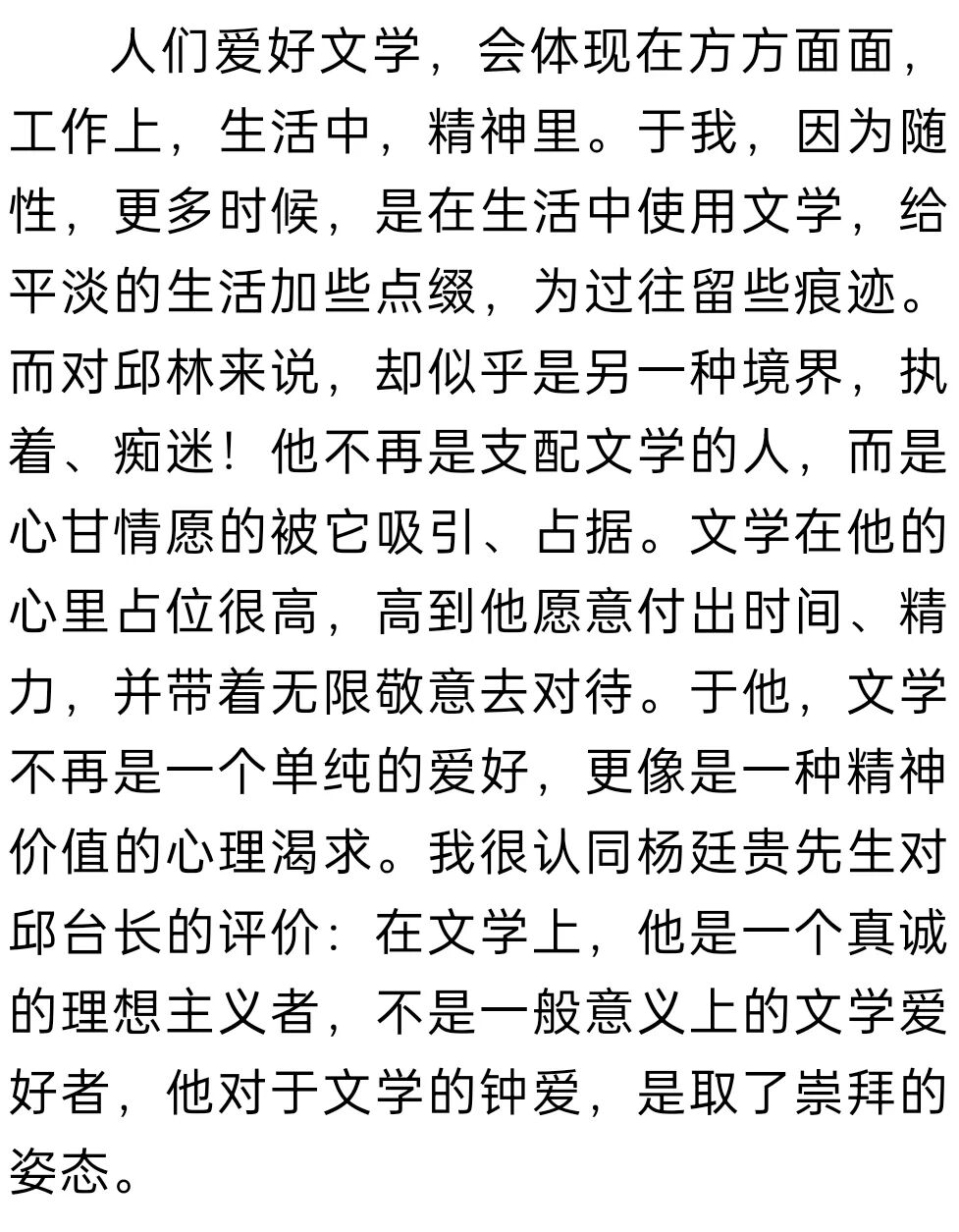 共事中,我偶尔也发表点诗歌和小文章,邱林知道我爱好文学,只要他的书出版,便会赠我一本。闲睱之余,我也会翻来看看。在他的字里行间,他的情感是细腻的,《牵挂》中与窗前玉兰树上的小鸟为邻,给予友谊,互相赋予的乐趣;他的亲情是感性的,看着《父亲的小扁担》担着带有乡土气息的米油菜的瘦削背影,眼中满含的泪水;他的胸怀是豪壮的,《南彊碎影》的边境战地中,冒着炸弹腾起的硝烟,依然把守在边关战场上的战士…这一篇篇的文学作品,已然垒积成邱林的精神矿产。