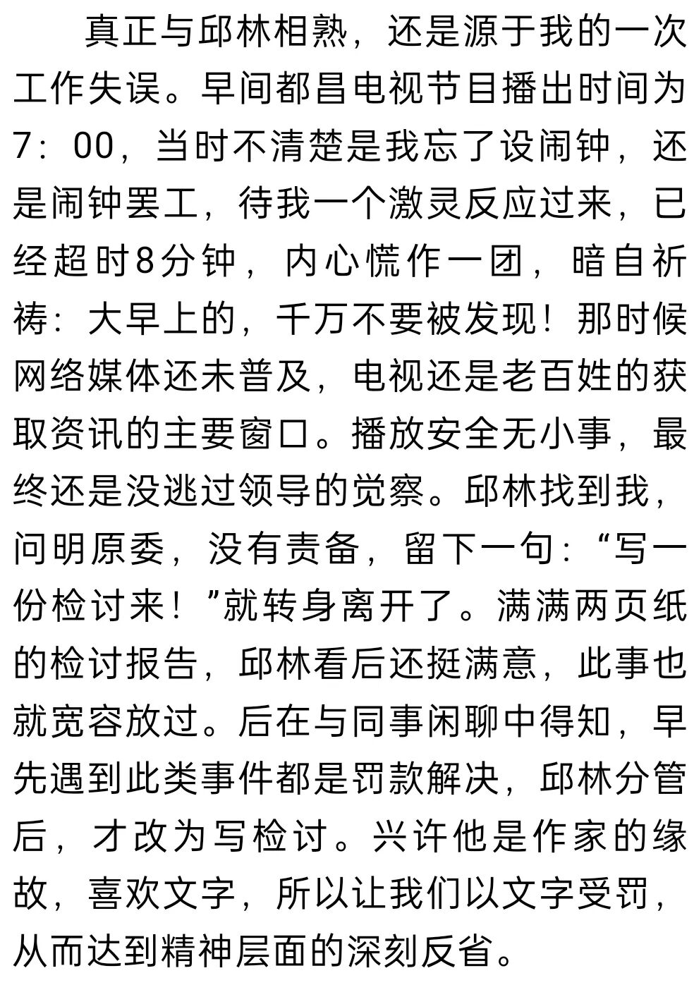 我与邱林认识于2007年,那时候我刚入电视台,分配在他分管的部门。起初泛泛之交,只从我父亲口中得知:“邱林是位作家,他的父辈是我们周溪林九里人,后迁去春桥的。” “作家?”我很惊讶。从此,我记住了他的这个称号。其实我的老家是西源乡,1962年从周溪公社分出,恢复为西源公社,但我的父亲还是习惯把周溪和西源视为同一片乡土。这份地理渊源,于我和邱林并没有直接关联,既然是父亲的熟人,那我自然也少了几分生疏。