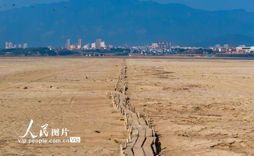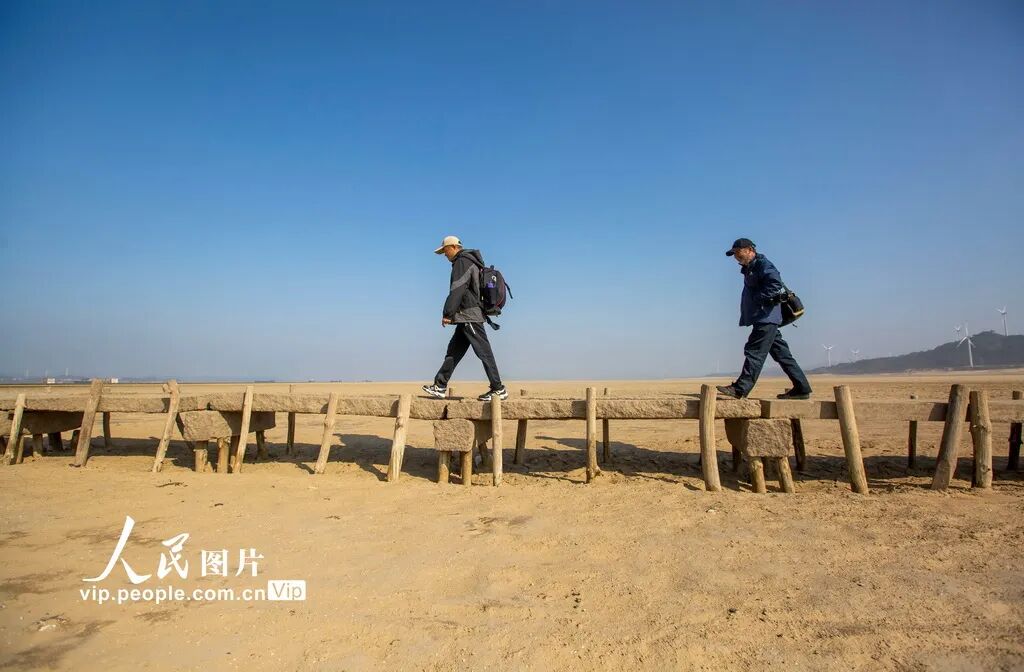 2024年12月14日,游人行走在鄱阳湖底石桥上