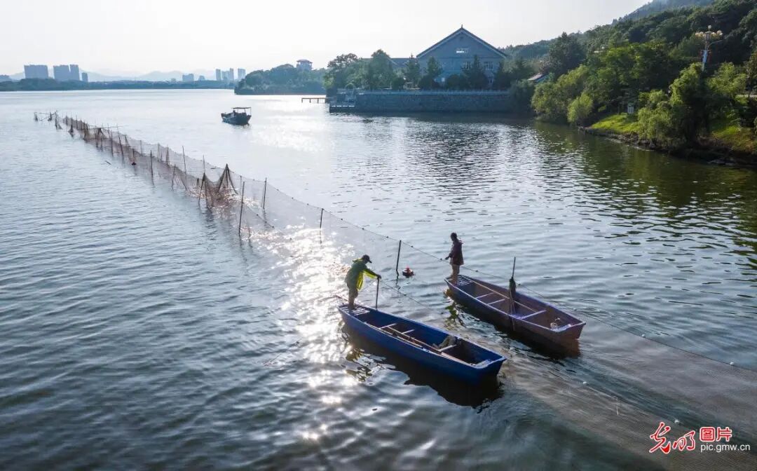 2025年6月17日,在江西省九江市都昌县东湖,渔民进行捕捞作业。近日,九江市都昌县东湖夏捕开网,大量新鲜鱼获供应江浙市场。