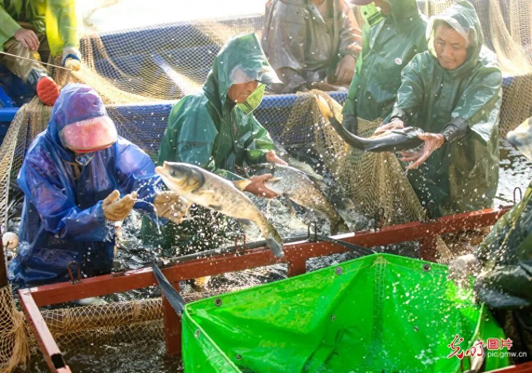 2025年6月17日,在江西省九江市都昌县东湖,渔民正在装运鲜鱼。近日,九江市都昌县东湖夏捕开网,大量新鲜鱼获供应江浙市场。