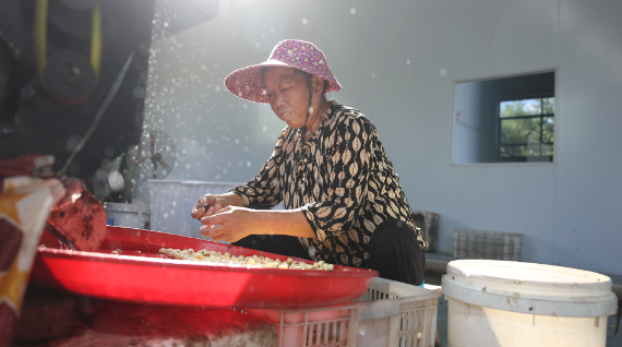 在山峰民心合作社农产品加工基地,采摘下来的新鲜莲子通过剥壳机脱壳,经过人工筛选和清洗后,随即送进烘干机内,最后制作成干莲子进行包装销售。