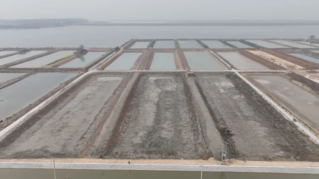 在矶山湖水产养殖场施工现场,记者看到,挖掘机正来回穿梭于养殖池岸,挥舞着长臂、转动着履带,对沉淀池等池塘进行改造。随着挖掘机铲斗抬起,沉淀池内的泥土和石块便被挖掘出来,现场一派繁忙有序的施工景象。