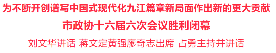 1月17日下午,中国人民政治协商会议第十六届九江市委员会第六次会议圆满完成各项议程,在市文化艺术中心胜利闭幕。会议号召,要更加紧密地团结在以习近平同志为核心的中共中央周围,锚定“十五五”目标任务,凝心聚力、奋发进取,高标准高质量建设长江经济带重要节点城市,为不断开创谱写中国式现代化九江篇章新局面作出新的更大贡献。闭幕会上,审议通过了政协第十六届九江市委员会提案委员会关于市政协十六届六次会议提案初审情况的报告、市政府关于市政协十六届二次会议以来(2022-2025年)建议案办理工作报告的决议、政协第十六届九江市委员会第六次会议决议。市委书记刘文华出席会议并讲话,市政协主席占勇主持并讲话。市委副书记、市长蒋文定,市委副书记黄强,市委常委、统战部部长、市政协党组副书记章剑飞,副主席徐红梅、王丰鹏、程向阳、陈保平、周杏连、丁喜春、李德恩,秘书长于先葵在主席台前排就座。廖奇志、饶芝新、邵九思、鲍成庚、韩潮、丁庆顺、熊晋喜、童兴等市委、市人大、市政府、九江军分区、市法院、市检察院、九江经济技术开发区、庐山管理局的领导,老同志代表,市有关单位厅级领导,以及政协第十六届九江市委员会常务委员在主席台就座。在浔的省政协委员,各县(市、区)委书记,市委各部门、市直及驻市中央、省属各单位主要负责人,各县(市、区)政协秘书长,市政府参事,海外特邀人士等列席会议。刘文华在讲话中指出,市政协十六届六次会议期间,各位委员以饱满的政治热情和强烈的责任担当,为改革发展建睿智之言,为民生福祉献务实之策,提出了很多有高度、有深度、有温度的真知灼见,彰显了心系大局、情牵民生的政治情怀,展示了昂扬向上、奋发有为的精神风貌。会议开得很成功,是一次高举旗帜、发扬民主、凝心聚力、团结奋进的大会。刘文华指出,“十四五”时期是九江发展极不寻常、极不平凡的五年。全市上下深入贯彻落实习近平总书记考察江西重要讲话精神,坚决扛牢建设长江经济带重要节点城市的使命责任,牢记嘱托、感恩奋进,解放思想、向江图强,按照省委打造“三大高地”、实施“五大战略”部署要求,构建“1+8”贯彻落实体系,全力推进“三大攻坚行动”,加快打造“三个区域中心”、建设“一个美好家园”,推动经济社会发展取得新的重大成就、发生令人鼓舞的可喜变化,经济运行稳中有进,工业经济提质升级,改革开放全面突破,文化旅游融合发展,城乡面貌品质提升,民生福祉持续改善。这些成绩的取得,根本在于以习近平同志为核心的党中央领航掌舵,在于习近平新时代中国特色社会主义思想科学指引,是党中央和省委坚强领导的结果,也是全市上下团结一心、同舟共济、携手奋进的结果。刘文华指出,全市各级政协组织和广大政协委员,始终同市委想在一起、干在一起,尽职担当、创新有为,在政治协商、民主监督、参政议政等方面做了大量卓有成效的工作。“十五五”时期是基本实现社会主义现代化夯实基础、全面发力的关键时期,也是九江大有可为、大有作为的重要阶段。希望全市政协组织和广大政协委员,立足新的起点,奋力在新征程上彰显新担当、展现新作为、开创新局面。刘文华强调,立足新起点、开创新局面,要在党的领导下把准政协方向。坚定政治立场,强化理论武装,恪守性质定位,着力把各级政协打造成为坚持和加强党对各项工作领导的重要阵地,成为用党的创新理论团结教育引导各界代表人士的重要平台,成为在共同思想政治基础上凝聚共识、增进团结的重要渠道。立足新起点、开创新局面,要在服务大局中彰显政协担当。围绕中心献策出力,为新时代九江高质量发展提供智力支撑,强化监督推动落实,着力推动各项改革发展举措落地落实,倾听民声增进福祉,真正把“委员作业”写在九江大地上、写进群众心坎里。立足新起点、开创新局面,要在凝心聚力中发挥政协优势。坚持大团结大联合,进一步增进共识度、扩大朋友圈、传播正能量,寻求最大公约数、画好最大同心圆、形成最大凝聚力。立足新起点、开创新局面,要在强基固本中展现政协风采。适应新形势新变化新要求,不断加强自身建设,坚持不懈抓党建、强本领、严作风。刘文华表示,市委将一如既往地重视、关心、支持政协工作,为政协履行职能、开展工作创造良好环境、提供有力保障。各级党委政府要将政协工作纳入全局工作谋划部署,支持人民政协依照章程开展工作,自觉接受政协民主监督,不断巩固党委重视、政府支持、政协主动、社会关注的良好局面。占勇在讲话中指出,政协第十六届九江市委员会第六次会议在中共九江市委的正确领导下,经过全体委员和与会同志的共同努力,圆满完成各项议程。刘文华同志的讲话我们要认真学习、深刻领会、抓好落实。占勇指出,五年来,市政协始终把牢正确政治方向,在中共九江市委的坚强领导下,与全市发展大局同频共振,为九江改革发展凝心聚力;始终聚焦主责主业,充分发挥专门协商机构作用,推动政协工作守正创新、提质增效;始终恪守为民初心,用心用情助力解决群众急难愁盼,彰显了人民政协为人民的本色;始终注重固本强基,持续加强“两支队伍”建设,展现了新时代人民政协的新样子,为九江经济社会高质量发展贡献了政协力量、发挥